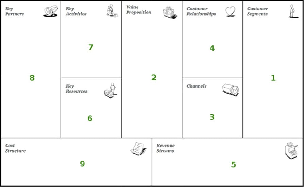 Für Analyse und Entwicklung gehen wir methodisch anhand des BMC Business Model Canvas vor, das in strukturierter Art und Weise Kernelemente des Geschäftsmodells zusammenfasst und Abhängigkeiten zwischen den verschiedenen Erfolgskomponenten zeigt. Die zentralen Ausgestaltungen schaffen Wertschöpfung und symbolisieren den Unternehmenswert.