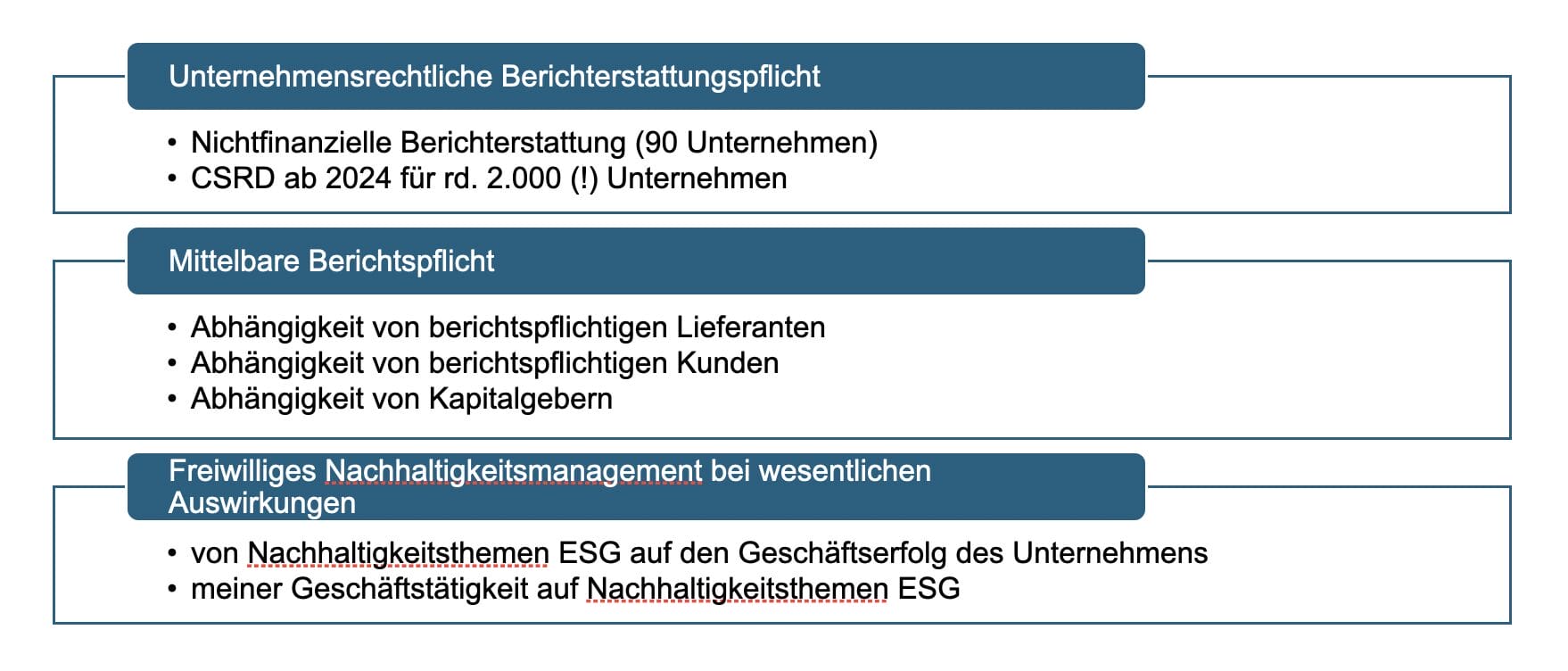 Environment - Social - GovernanceBerichterstattungspflichten sind als CSRD - Corporate Sustainability Reporting Directive auf EU Ebene definiert und in den ESRS - European Sustainability Reporting Standards (E1 - E 10) und der EU Taxonomie-Verordnung weiter konkretisiert.